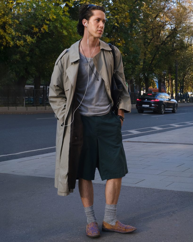 Плащ из парижской винтажки, шорты — Jacquemus, сумка — Bottega Veneta, аксессуар на шее — Balenciaga, лоферы — John Galliano.