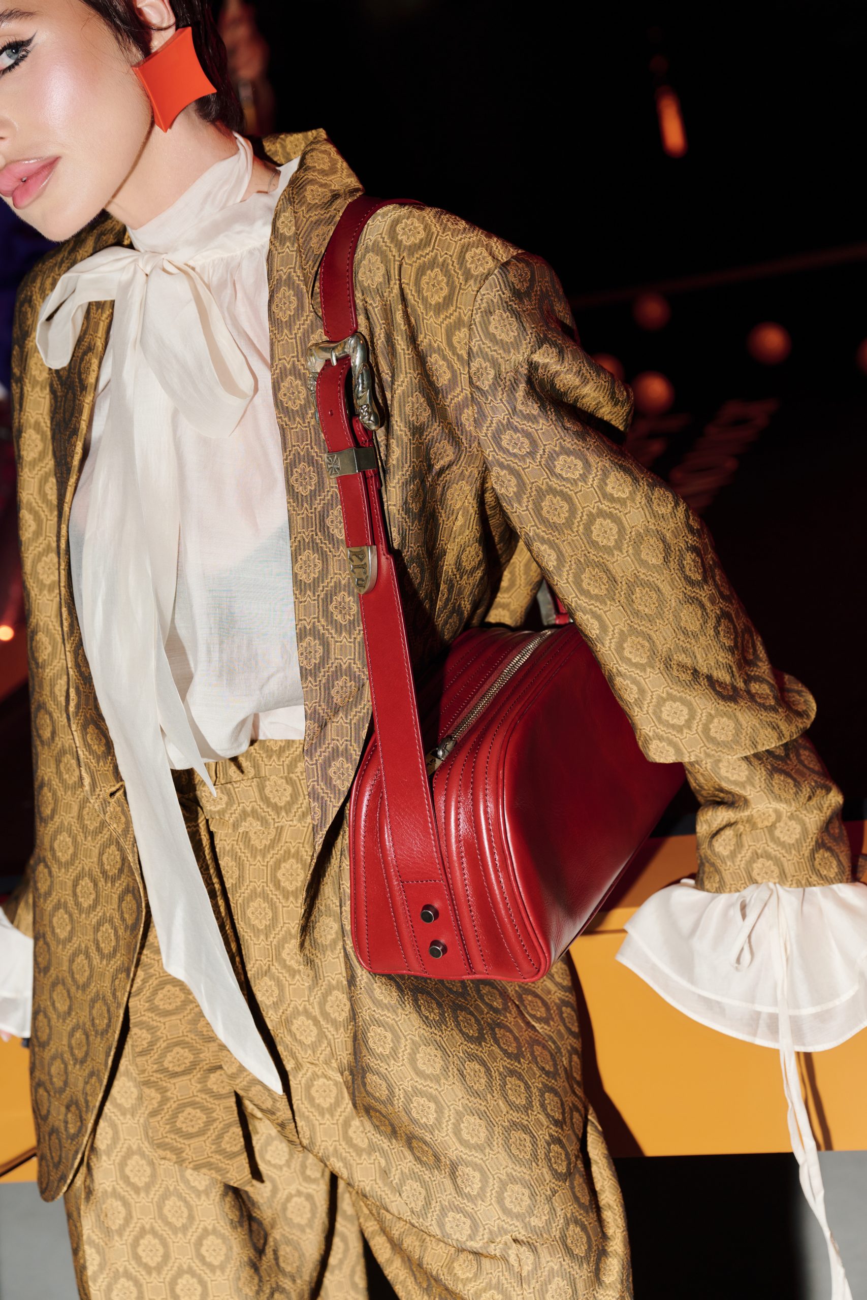 Помимо обуви, в коллекцию вошли аксессуары, отсылающие к эстетике ретро-гламура, например, сумки-шоперы с бахромой и кисеты со съемными ручками, а также цепочка на талию с символичным бантом, широкие браслеты, ободок для волос и очки-авиаторы в двух вариантах оправ.