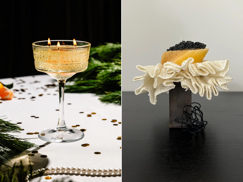 «Маленький свечной заводик» Soul Hygge традиционно отрабатывает новогоднюю тематику на 10 из 10. Помимо уже знакомых многим свечей — ингредиентов оливье, к праздничному столу можно подать восковые бутерброды с черной икрой (1900 руб.), игристое в хрустальной креманке (3800 руб.) и зефир (2400 руб. за 4 шт.). Кстати, если внимательно пролистать несколько экранов главной страницы, можно найти скидку 10% на первый заказ.