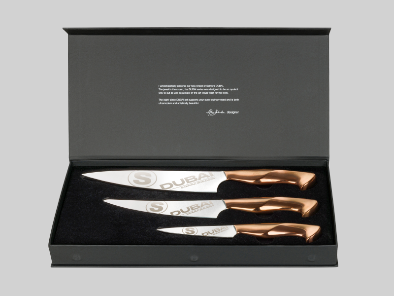Если приметы про острые предметы не вписываются в вашу картину мира, присмотритесь к коллекциям локальной марки Samura. «Пока мои более умные сверстники осваивали мир крипты и финтех, я рисовал все новые и новые коллекции ножей, пытаясь усовершенствовать то, что практически не изменилось за последние 3000 лет», — рассказывает основатель бренда Алексей Яковлев. Коллекцию Dubai он называет кутюром и адресует «тем, кто знает: роскошь не требует объяснений — она просто ощущается». В «кутюрную» серию вошли восемь видов стальных ножей — от филейного до овощного — с рукоятями цвета розового золота. Продаются по отдельности (от 8000 руб.), в формате «поварской тройки» или полным комплектом.