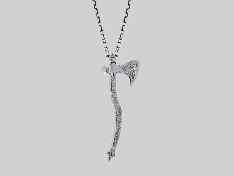Подвеска Viking (42 900 руб.) в форме скандинавского боевого топора IX–XI веков, которым пользовались викинги и их дружины, — часть первого мужского дропа Sevenworlds. Мастера бренда изготовили украшение из высокопрочного кобальта, который практически не царапается и не тускнеет, в технике старинной ковки. Это делает поверхность подвески настолько фактурной, что кажется, будто у вас в руках исторический артефакт.