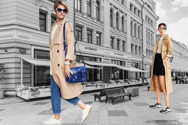 Все более популярным становится сочетание тренч+кроссовки. Обычно тренч бежевый. Все хотят бежевый тренч, да. Весь прошлый год стилисты уверяли народ, что оверсайз тренч и кроссовки — это очень-очень красиво, и вот теперь уже куда ни глянь — там будет девушка в бежевом плаще и в кедах. Прямо сейчас стилисты опять говорят: тренч — это ужасно стильно. Значит, их будет еще больше. Если у вас мощная воля — держитесь. Хотя бы не покупайте бежевый — поищите красный. Ну или зеленый.