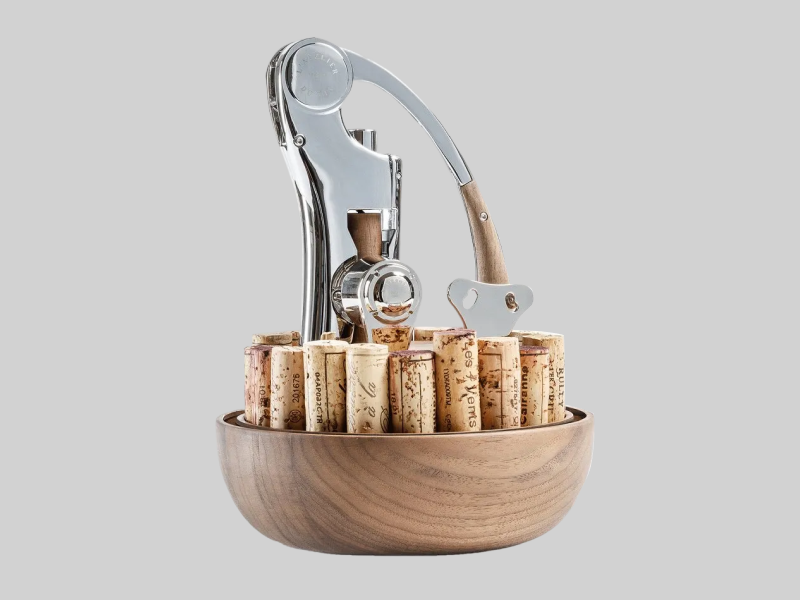 L’Atelier du Vin — премиальный французский бренд, который с 1926 года производит в Шампани аксессуары для энофилов. В подарочный набор Oeno Motion Groom входят рычажный штопор, резак для фольги и инструмент для открывания пробок шампанских и игристых вин. Аксессуары ручной работы эстетично сгруппированы на подставке из орехового дерева и накрываются куполом из выдувного стекла. По периметру основания — место для сбора собственной коллекции пробок. Продается в ЦУМе.