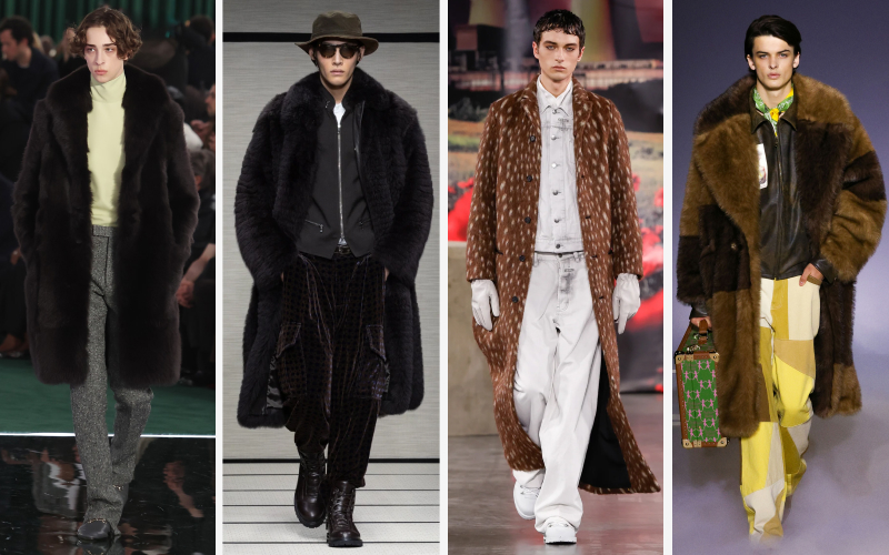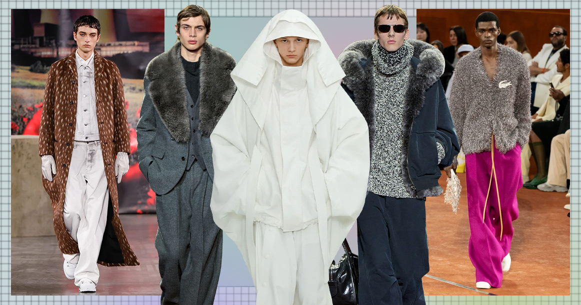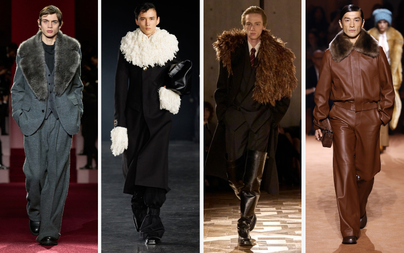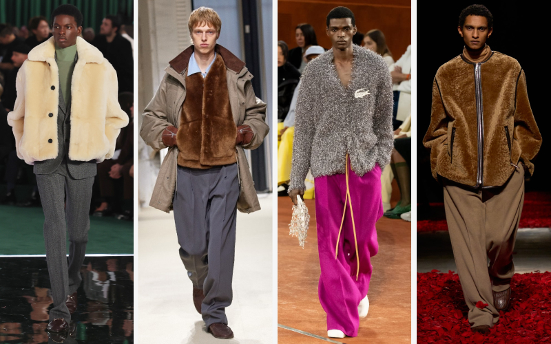 Тренд на плюшевые текстуры, некогда считавшиеся прерогативой женского гардероба, теперь уверенно закрепился в мужском. Gucci, Ferragamo, Sacai и Lacoste переопределяют понятие мужской силы через объемные, тактильно приятные бархатистые и вельветовые ткани, в то время как Prada и Auralee из шкур и искусственного меха сделали топы и жилетки.