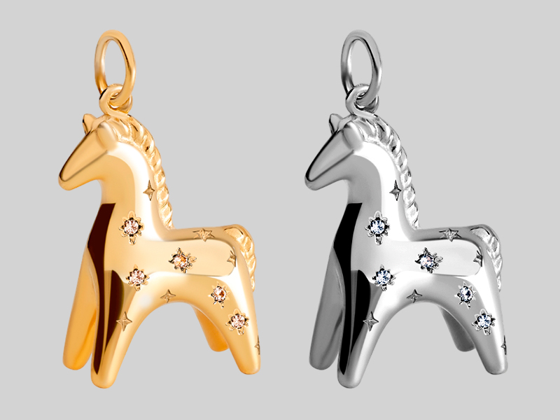 А вот и первый символ предстоящего года Лошади. Московский бренд авторских украшений Qari Qris подошел к вопросу в своем стиле — с отсылками к детству и культурному коду. Так что их ювелирная лошадка (12 000 руб.) напоминает дымковскую, только не в яблоках, а в камнях: есть позолоченная и серебряная. Украшение можно носить на цепочке как подвеску или на хупе как сережку. Продается на сайте и в магазине бренда на Петровке.