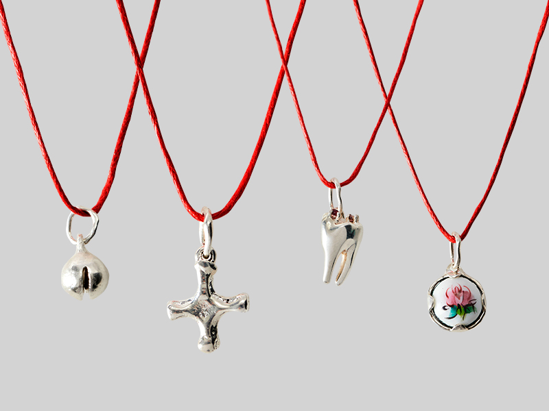 Московская художница и ювелир Анна Павлова, которую многие знают по сложносочиненным украшениям Mineral Weather, запустила собственный бренд. Украшения Out Of The Blue трогательные и личные. «Это история про перемещения, про бесконечные сборы чемоданов и упаковывание вещей, про то, что во время такой нестабильности хочется хоть капельку надежного», — объясняет Павлова. В роли артефактов, которые хочется сберечь и носить на веревочке ближе к сердцу, в дебютной коллекции выступили бубенчик по мотивам старинных украшений (5500 руб.), крестик — копия археологической находки (7500 руб.), зуб с кариесом (7000 руб.) и финифть, расписанная ростовскими мастерицами (7000 руб.).