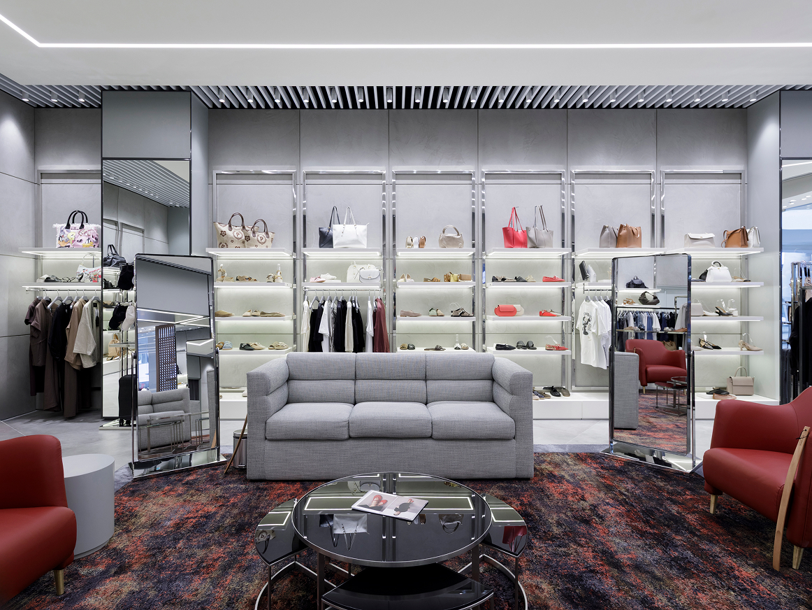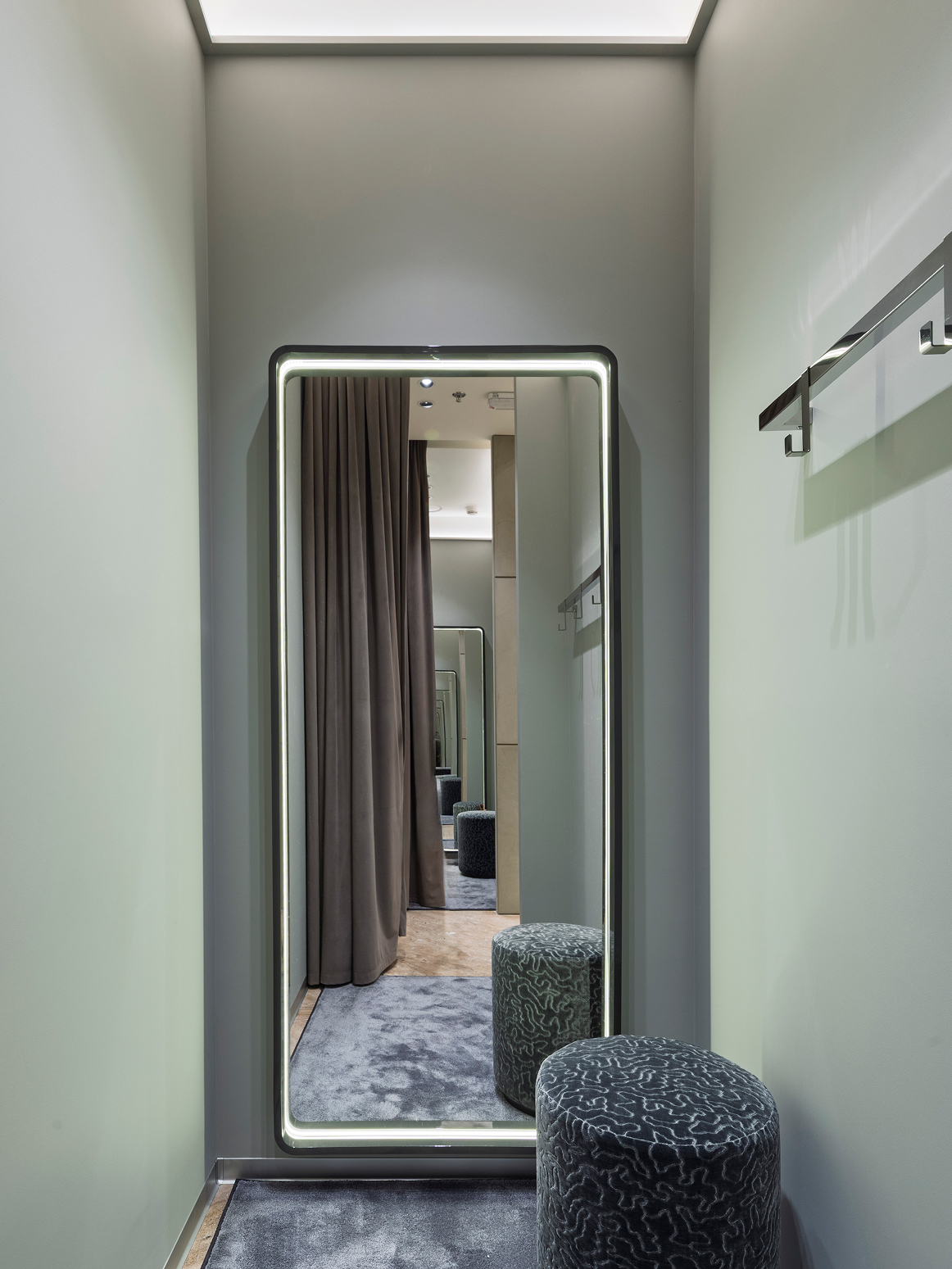 Мультибрендовая сеть No One переходит к новому визуальному коду своих бутиков. Его разработали совместно с итальянским дизайн-бюро в эстетике софт-футуризма: строгие стальные конструкции смягчаются акцентными коврами и мягкой мебелью из рогожки. Пространства магазинов — открытые и с эргономичной планировкой — дополнены зонами для примерки одежды. Большое внимание уделено световому дизайну: LED-подсветка на стеллажах позволяет рассматривать вещи без искажения оттенков, а в примерочных продуман мягкий рассеянный свет.