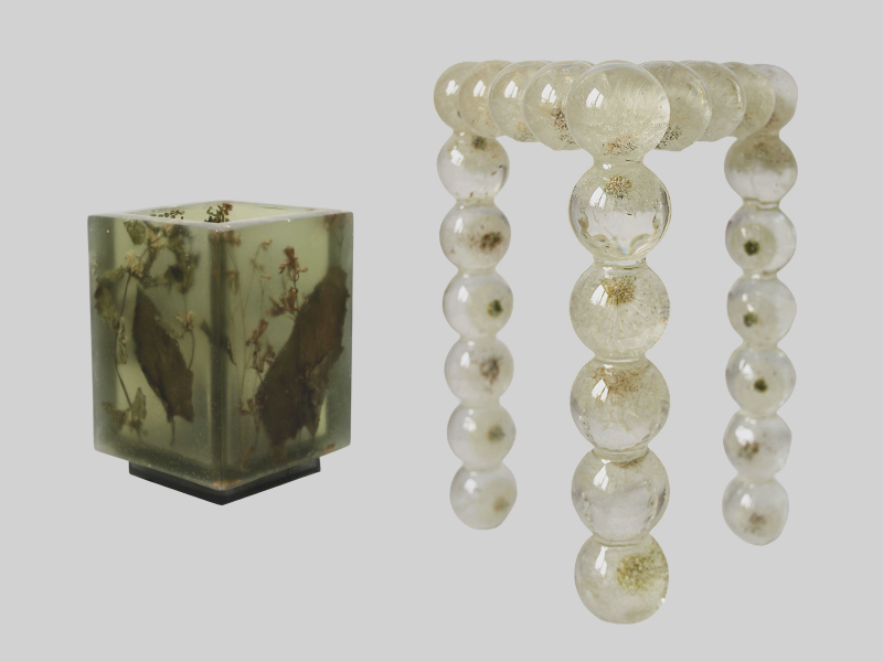 Предметный дизайнер Аня Андронова предпочитает малые скульптурные формы крупным, а эпоксидную смолу и полевые и садовые растения — другим материалам. «Для меня важно создавать изделия своими руками, от сбора цветов в поле и до финишной полировки смолы, так не теряется эмоциональная связь с работами», — объясняет дизайнер. Результаты ее полевого скаутинга можно увидеть внутри настольных светильников (40 000 руб.) и столиков с одуванчиками (67 000 руб.), а заказать — на сайте галереи Sample.