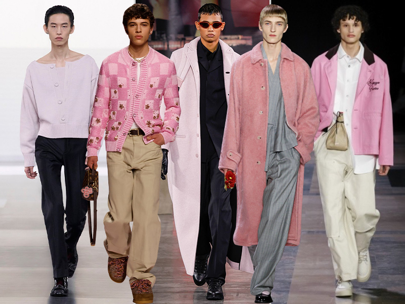 Дизайнеры еще с летних показов уверенно делают ставку на розовый в его пастельных итерациях. В добавление к традиционной для осени темной гамме дизайнеры предлагают более легкий и жизнерадостный вариант. Kenzo, Louis Vuitton и Dior Men сделали нежный розовый главным акцентом в шерстяных пальто, стеганых свитерах и элегантных жакетах на выход.