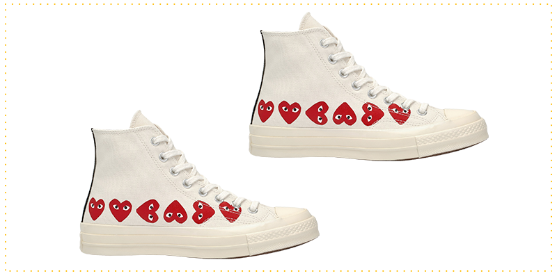 Другой бесспорный фаворит московских магазинов — кеды из коллаборации Сonverse и Comme des Garçons с глазастыми сердечками. Если не страдаете плоскостопием, ищите их в Air Moscow (11 800 рублей) на четвертом этаже «Цветного» и в концепт-сторе КМ20 в Столешниковом переулке.