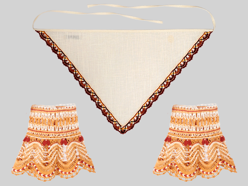 К созданию новинок — съемных манжет с ажурным орнаментом (16 000 руб.), галстука-банта (14 000 руб.) с жемчужной пуговицей и отделанных кружевом косынок (4500 руб.) — локальная марка Polina Repik привлекла михайловских кружевниц. Михайловское кружево — единственная техника плетения с цветными нитями и один из последних сохранившихся в России кружевных промыслов, который передается мастерицами из поколения в поколение. Косынки, кстати, можно персонализировать — добавить вышивку с инициалами.