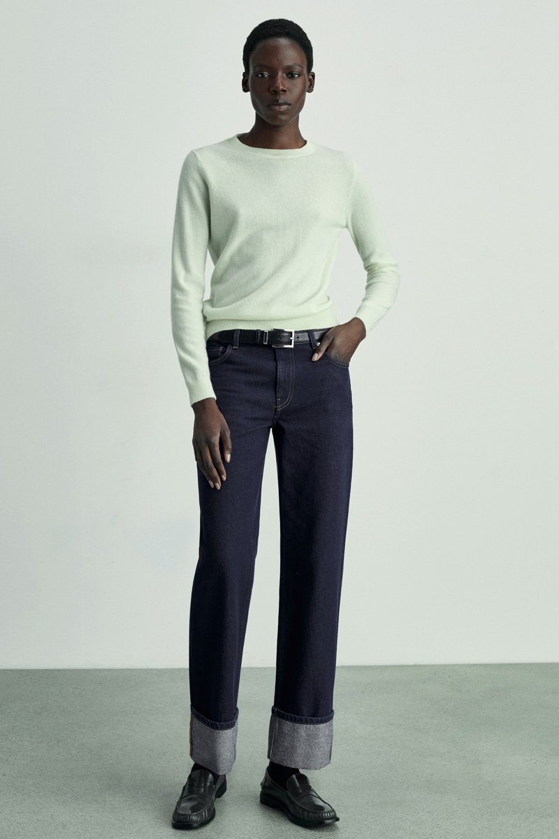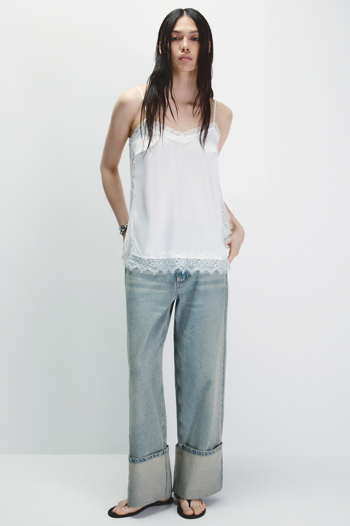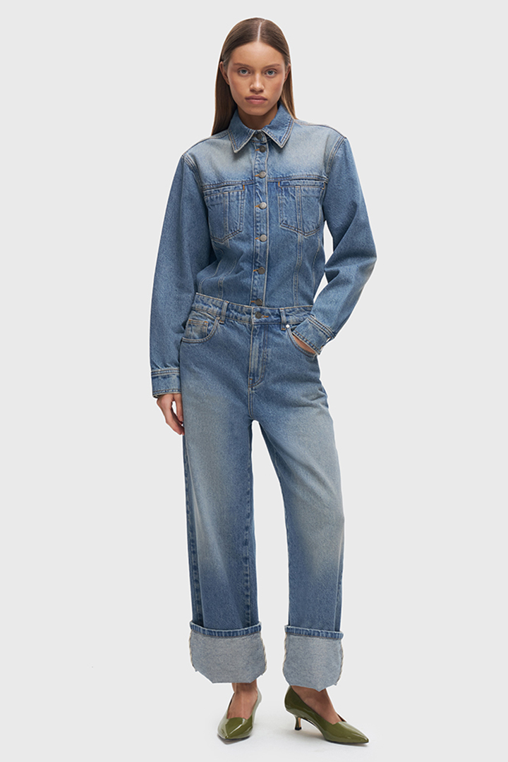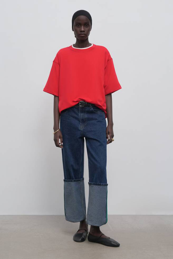 На осенне-зимних показах 2025-го дизайнеры дружно подкатывали джинсы, потом идею подхватили стилисты, а за ними и массмаркет. С одной стороны, высокий подворот отсылает к рабочему происхождению денима, к его утилитарной ДНК. С другой — этот ироничный прием делает даже самый базовый образ на повседневку визуально сложнее и многослойнее. Подворот добавляет необходимую небрежность и незаконченность образу, чтобы он выглядел чуть более расслабленно.
