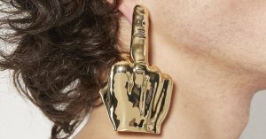 Коллекцию весна—лето 2023 года хулигана Мартенса, куда вошло и это украшение, живо обсуждают в западной прессе. Серьгу называют «возмутительно грубым аксессуаром», а показ «смелым» или «зрелищем не для слабонервных». Нежная и толерантная публика шокирована высказываниями дизайнера. А вот у нас такое украшение с факом, скорее всего, не заставит никого даже бровь поднять — средний палец для нас вовсе не вызывающий жест. Разве кто-нибудь, например, обратит внимание на коллегу, пришедшего на работу в футболке с надписью «Fuck you»? Вряд ли.
