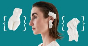 Так появились серьги «Мифологическая дева» — тоже фарфоровые. Этот объект состоит из двух частей: голова девы и тело девы. Голова крепится на клипсе, а тело — на гвоздике. Создатели предлагают носить эти серьги двумя способами: обе части на одном ухе или верх на одном, низ на другом. Причем нужно учитывать способность вашего уха вынести эту красоту: вес головы и тела — по 5 граммов, то есть всего 10. И размер немаленький — 6 × 2,5 см и 5 × 2 см. «Девы» бывают белые, «золотые» и «платиновые» — все фарфоровые, покрытые краской.