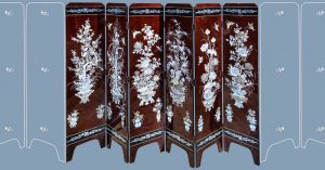 Ширма довольно нестандартная, так как полностью деревянная. Это не очень характерно: чаще можно встретить деревянный каркас и тканевое заполнение, а на нем уже рисунок. Это поздний английский классический стиль второй половины XIX века, викторианский извод того, что называется шинуазри.