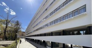 Из запланированных архитектором зданий комплекса было осуществлено лишь два. Это четырехэтажный куб коммунального блока и соединенный с ним переходом жилой шестиэтажный дом, 85-метровый в длину.