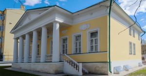 Стройный портик из шести тосканских колонн огражден балюстрадой и превращен в уютную террасу. Дом небольших размеров имел еще одно деревянное крыло и корпуса хозяйственных служб в глубине двора, но все это не уцелело. Зато здание сохранило свое обаяние и планировку внутренних покоев с парадной анфиладой, спальней с колоннами и плафоном, низенькими антресолями, гостиной, выходящей окнами в сад.