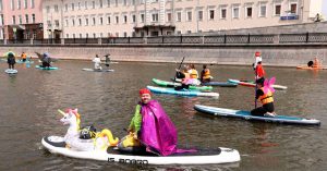 В субботу в Москве стартовала «Рыбная неделя» — популярный в городе гастрономический фестиваль. В рамках его проведения москвичи участвуют в массовом карнавальном заплыве на сапбордах в акватории Москвы-реки.