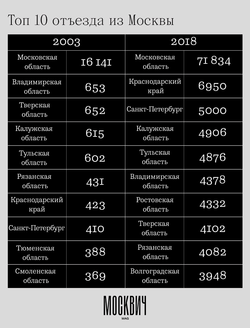 Так вот, по данным Росстата, если с 2003 по 2009 год все было довольно стабильно и из столицы переезжали порядка 30 тыс. человек в год, то в 2010-м таких мигрантов стало уже более 39 тыс., в 2011-м — 65,7 тыс., в 2012-м — 99,7 тыс. И далее в том же направлении вплоть до 255 тыс. уехавших в прошлом году. Правда, ведущий научный сотрудник Института социального анализа и прогнозирования РАНХиГС и редактор электронной газеты «Демоскоп Weekly» Юлия Флоринская особо не советует доверять этим данным.