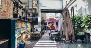 Этим летом внутренний двор разукрасили с такой неудержимой силой, что даже скептики-ретрограды в какой-то момент попадали со своих стульев (на трезвую голову). Архитектор Сергей Покровский и художник Георгий Чушба придумали, что японский аниме-сериал «Дорохедоро» станет новой канвой декораций. Пальмы, герань, дикий виноград тут тоже есть. Несмотря на все вечерне-ночные безумства, утром и днем тут идеальные условия для работы. Все пишут. Кто сценарии, кто пьесы, кто романы, кто колонки и рецензии. Никакой прокрастинации. Наверняка кто-то даже пишет стихи и сочиняет музыку, но я лично с поэтами и композиторами пока не знакома. Мой любимый стол — круглый, с соломенными креслами, тот, что у первого окна.