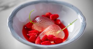 — в разделе «Для худеющих» замечены оптимистический запеченный цыпленок (950 руб.) и еще одно невесомое желе из шампанского (в виде прозрачных ягод клубники) с живой, пахучей садовой земляникой (650 руб.);