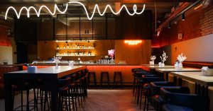 — непритязательный интерьер с голыми кирпичными стенами и неоновой надписью на стене «Вечно молодой. Вечно 20»;