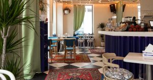 — обстановка напоминает что-то среднее между трактиром и кофейней с семейными коврами на полу. Преобладают белый и синий цвета;