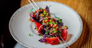 — шашлык из говяжьей вырезки тянет на 1590 руб., бургер-кебаб стоит 990 руб., кускус с овощами — всего 520 руб.;