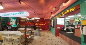 — отдельная пятерка с плюсом за интерьер с кафельными столами цвета крыла фламинго и с девизом на бирюзовой стене: «Каждый борщ мечтает стать пирожком»;