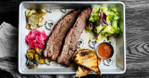 — ломти брискета подаются с огурцами, замаринованными с бурбоном: потрясающе правильное сочетание, с искорками и щекоткой языка;