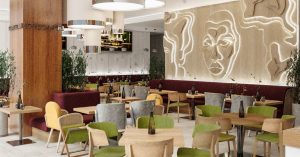 Кофе тоже будет — куда же без него. Для напитков и десертов здесь предусмотрено отдельное меню. Да и в интерьере подчеркивается кофейная тематика: в ресторане поставят огромный ростер в форме глобуса.