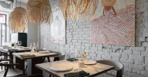 — много дневного света, соломенные абажуры и старая кирпичная кладка выкрашена в белый цвет. Пышные зеленые фикусы и пальмы в сочетании с макраме то на лампах, то на стене организуют дополнительный комфорт. Колосья, ветки и прочие сухоцветы легко вписываются во весь этот экорежим;
