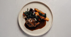 — блестящие томленые щечки с разноцветными зимними корнеплодами и листьями кейла (1690 руб.) густо пахнут грибами. Текстура мясной плоти напоминает мягкое сливочное масло — красота;