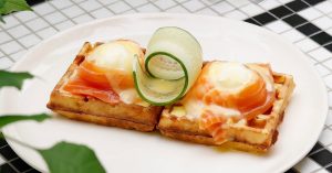 — новаторская вафля из фалафеля (670 руб.) из мятого нута и с мятым авокадо дополняется жареным тофу и вялеными томатами. Вафлю можно слопать в одиночном виде, а можно с лососем (еще 480 руб.), или с яйцом пашот (60 руб.), или с беконом (180 руб.). Мой любимый вариант — с беконом. Приятно мягкая вафля. Тофу полон неожиданной жирности. Полупрозрачные ломти огурца весело хрустят. Авокадо залит лимонным соком. Все вместе — плотный обед;