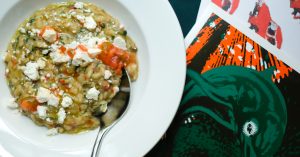 — «Ризотто в балканском стиле» (830 руб.), с одной стороны, сохраняет характерную кремово-пластичную структуру, а с другой — явно веселится из-за добавки мякоти печеного баклажана и смеси пекорино с фетой. Фисташки и белое вино тут ради еще большей беззаботности;