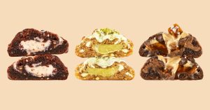 — «Чизкейк-черника» (440 руб.) — мягкий и комфортный вариант с творожным сыром. Черничные ноты в нем мелодично сочетаются со сливочным характером белого шоколада. Классическое печенье для пасмурного дня, когда считать калории совершенно бесполезно;