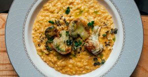 — ризотто в духе карри (740 руб.) красиво украшено соцветиями брокколи в тонкой кружевной темпуре. Густой, пряный, праздничный вкус. Ризотто приготовлено на кокосовом молоке. Это фантазия на тему аштанги-йоги. Дает силы для самых неподъемных задач (в моем случае абсолютно точно);