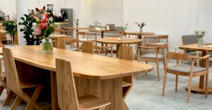 — высокие потолки, бетонные стены, много света и мебель цвета теплого натурального дерева. Грамотное зонирование посадочных мест, используется каждый сантиметр. В результате получается уютная обстановка с красивыми цветочными композициями на столах;