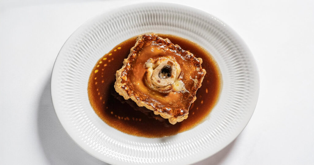 — «Пастуший пирог из Гента» (1250 руб.) — замечательное создание с абсолютно развратной сутью. Тонко пахнет розмарином. Мозговая косточка торчит по центру. Аппетитное слоеное тесто нежно обнимает эту горячую субстанцию с картошкой, мясом, сыром и умами-соусом из выпаренного бульона. Великолепно. И славный фландрский город Гент явно не в обиде;
