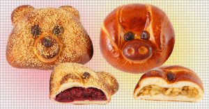 — «Мишка с малиной» (316 руб.) — полноценная рожица медведя из советского мультфильма с ушами, глазами и носом. Никакой приторности, но достаточно малиновых ощущений внутри. Двусторонний кисло-сладкий вкус начинки и вменяемое тесто без излишней, надоедливой плотности. Проблема только с ушами — они слишком тугие. Уши хочется отломить и намазать дополнительно и крем-чизом, и смородиновым вареньем — получается отдельная закуска;
