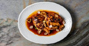 — «Цыпленок с огня/белые грибы» за 1402 руб. — легкая вещь по сравнению с пастой с лангустинами (2380 руб.) — двойная порция пасты домашней выделки с обжаренными на гриле лангустинами приправлена чили и базиликом, а соус на основе беспроигрышного биска на кокосовом молоке добавляет этой композиции абсолютно животного аппетита. С цыпленком с пюре из черного чеснока и пармезановым кремом все по-другому — у него более задумчивые настройки;