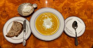 — легкий и гладкий тыквенный суп со страчателлой (710 руб.). Вместо привычных сухариков в нем используются кусочки свежего фенхеля — отличная находка. Кроме того, в суп добавлен кардамон. Получается очень интересно и познавательно с точки зрения гастрономического кругозора и органолептической многослойности;