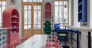 — в кафе стоят розовые стулья и наблюдается общее солнечное состояние;