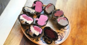 — слоистая оболочка напоминает хлебный мякиш бородинского. Начинка медленно тает, и эту «жемчужину» надо есть руками, кусать тесто вместе с мороженым. Начинка №159 — это мороженое «Розовый дракон с японской айвой и базиликом», свежий вкус с кислинкой;