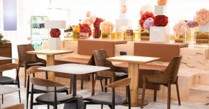 — есть попытка отделить пространство для еды от магазина косметики, например тумбами с цветами, но автономия все равно не выходит.