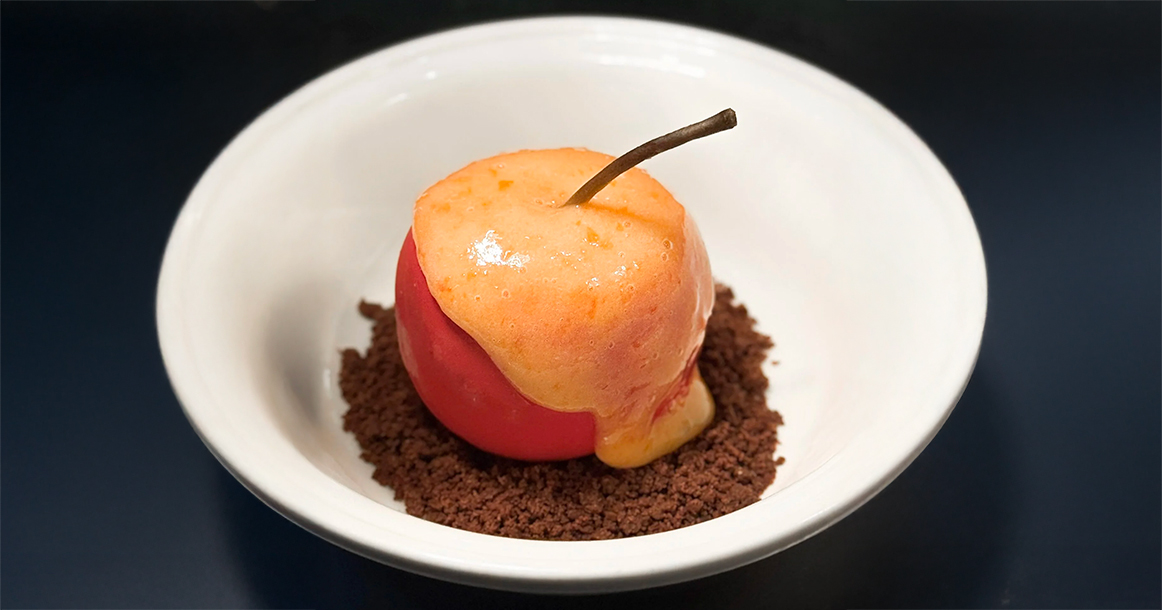 — десерт «Яблоко no age» (590 руб.) — предсказуемое запеченное яблоко с мороженым и апельсиновой карамелью понравится тем, кто никогда не печет яблоки дома и редко ест мороженое;