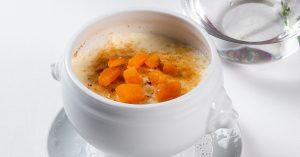 — в конце концов гурьевскую кашу собирают как торт — слоями из манки и сливочных пенок, добавляя варенье и быстро запекая в духовке снова, а затем подают в той же посудине, в которой десерт готовился. В случае с гранд-кафе гурьевская каша приезжает на стол в белой и миниатюрной керамической чаше-супнице — достаточно глубокой, чтобы почувствовать всю глубину падения в сладкие недра светской русской каши;