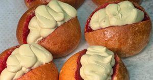 — кольцо «Фисташка-грейпфрут» (540 руб.) — роскошь с изумительным заварным тестом с тонкой хрустящей корочкой. Густой и уникальный фисташковый вкус и контраст горьковатой, свежей кислинки грейпфрутового мармелада с мятой — прелесть что такое.