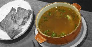 – «Уха забористая с кулебякой» обладает посредственным внешним видом и тоскливым вкусом. Кубики стерляди в бульоне прозрачно намекают на заботливо выращенную аквакультуру: слегка резиновый внешний слой и распадающаяся слоистая мякоть;