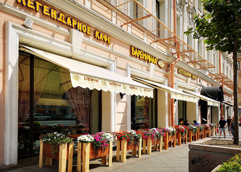 Выходите на прямую дорогу к Спасской башне. На тротуаре Тверской вас поджидают столы «Вареничной №1». Уставшие от достопримечательностей дамочки среднего возраста могут присесть рядом с нарезкой «докторской» из «Елисеевского» и есть эту колбасу руками, игнорируя вареники всех мастей из упомянутого кафе. Из динамиков орут ностальгические хиты советской эстрады.